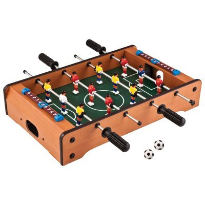 Forget bringing the party to the game, bring the game to the party with the classic Table Top Foosball. Modeled after a full-size foosball table, this mini table top provides big time entertainment. It's crafted from medium wood to withstand wear and tear and comes complete with two soccer-designed foosballs and a classic slide score.